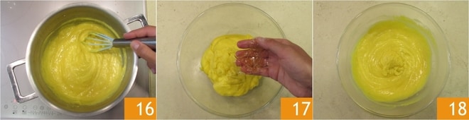 Put the saucepan on the stove and thicken over low heat, stirring continuously with the whisk 16. Once thickened, transfer the cream to a bowl and add the well-squeezed gelatin sheets 17, then mix thoroughly to incorporate them evenly. Let it cool 18, cover with cling film in contact, and put it in the refrigerator for about 30 minutes.