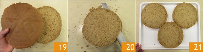 Meanwhile, take the sponge cake and remove the upper crust 19, then cut it into 3 disks of equal thickness 20 21.