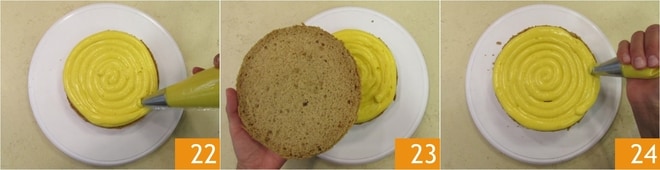 Take the cream from the refrigerator, give it another stir, and transfer it into a pastry bag with a 1 cm plain tip. Place the first sponge cake disk on a serving plate and fill it with half of the custard 22, then cover with the second disk 23 and add the remaining cream 24.