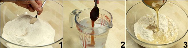 Here’s how to proceed to prepare the no-knead ciabatta. Pour the flour into a large bowl, then add the dry yeast 1. Dissolve the salt and malt in warm water 2, mix well, and then pour the mixture into the bowl 3 with flour and yeast.