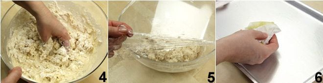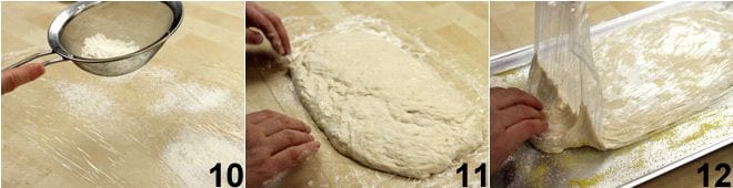 Sprinkle the plastic wrap with plenty of all-purpose flour 10. Pour the dough over the floured wrap 11 and, flouring your hands, give it a fairly flat and elongated shape. Move the wrap close to the baking sheet and with a decisive motion, flip the dough onto it 12.