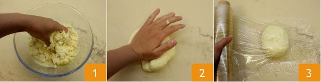 To prepare the cicatielli with mussels and beans, start with the fresh pasta: pour the semolina into a bowl, add the warm water and olive oil. Begin to handle the ingredients in the bowl 1 and when the dough is firmer, transfer it to a lightly floured work surface and knead it vigorously 2 until you obtain a smooth and elastic dough. Wrap it in plastic wrap and let it rest for about 30 minutes at room temperature.