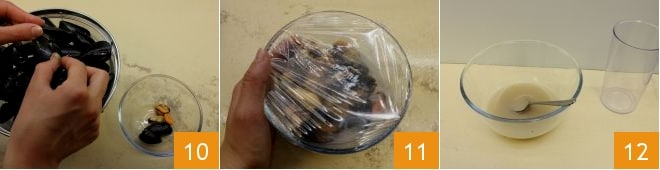 drain the mussels, keeping the liquid to flavor the seasoning, leave some mussels whole, and remove the seafood from the majority of the mussels 10. Cover the seafood with plastic wrap and set them aside along with the cooking liquid (11-12).