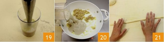 Blend everything with an immersion blender 19 and then pour the cream into the pan with the beans 20. Take the dough, divide it into pieces to make thin cords 21.