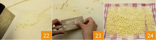 then divide each cord into pieces of 1-1.5 cm 22: to create the typical hollow of the cicatielli, press with your thumb each piece of dough on the gnocchi board 23: you can also press with your thumb and slightly drag each piece on a smooth work surface. As you make them, you can arrange them on a tray lined with a lightly floured towel 24.