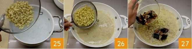 turn on the very low heat and stir to wilt the scallion; then add the chopped chili pepper 16. Add the cannellini beans (we used pre-cooked ones, but you can also use dried ones after soaking and boiling them separately) 17 and let them cook and flavor for about ten minutes. Then turn off the heat and take out two tablespoons: pour them into a tall container along with the mussels' liquid 18