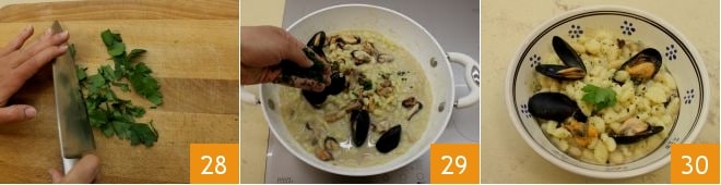 Finally, finely chop the parsley bunch 28 and add it to the pan 29: turn off the heat and your cicatielli with mussels and beans are ready to be enjoyed 30!