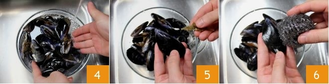 Move on to cleaning the mussels: rinse them thoroughly under running water 4, then remove the byssus 5, the beard protruding from the shell, and scrub them one by one to remove impurities 6.