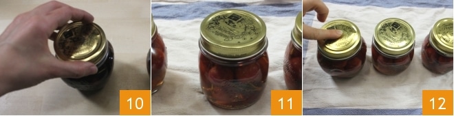Seal the jars well 10: if using jars with screw caps, screw the caps on well, but without overtightening 11. At this point, you can proceed to boiling: i.e., pasteurization, following the instructions provided in the guidelines from the Ministry of Health cited at the end of the recipe. If using jars with screw caps, once the jars have cooled, check if the vacuum was created correctly: you can press the center of the cap, and if you don't hear the typical "click-clack," the vacuum was created 12. If using jars with rubber seal closures, when consuming the cherries, you can check the vacuum by pulling the appropriate tab: if it makes a sharp noise when pulled, it means the contents have been preserved with the correct vacuum. Conversely, if the tab feels "soft" when pulled, it means the vacuum was not created correctly, and it's better not to consume the contents.
