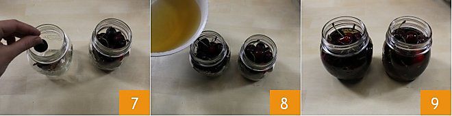Also jar the cherries 7, leaving about 0.75 inches of space from the rim and trying to arrange them in such a way as to leave as few empty spaces as possible, without crushing them too much. Now add the Port syrup 8 making sure to completely cover the cherries but leaving 0.5 inches of space from the rim 9. With the indicated amounts, you will obtain three jars with a capacity of 8.5 ounces.