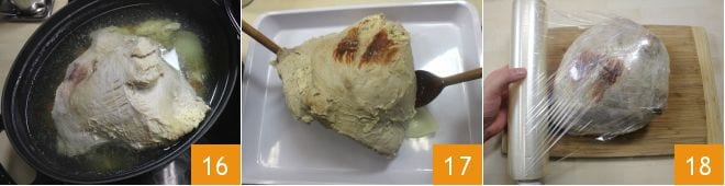 When the broth is boiling, salt the water and insert the well-closed pocket, which will need to cook for about 3 hours over low heat 16. After this time, drain it from the broth 17 and wrap it tightly in plastic wrap 18