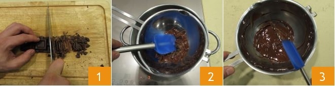 To make the dark chocolate pralines with mascarpone cream, start by chopping the dark chocolate with a knife 1, heat the chocolate in a bain-marie 2 until it is completely melted 3.