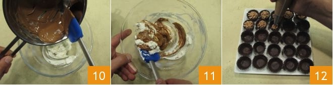 Pour the melted milk chocolate into the bowl with the mascarpone 10, mix again until you obtain a homogeneous cream 11. Transfer the cream into a piping bag with a star-shaped nozzle and let it set in the refrigerator for about 1 hour. After this time, take both the chocolate cups and the cream, squeeze a tuft of cream on each chocolate 12. Once all the chocolates are filled, garnish half with chopped hazelnuts and half with chopped pistachios.