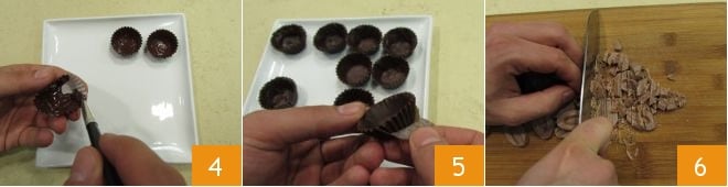 At this point, brush the inside, including the edges, of the small molds 4. Place them on a tray and let them harden in the refrigerator for 1 hour. After this time, take the molds back, make sure the chocolate is firm, and then gently remove them from the molds 5. Meanwhile, work on the cream: also chop the milk chocolate 6,