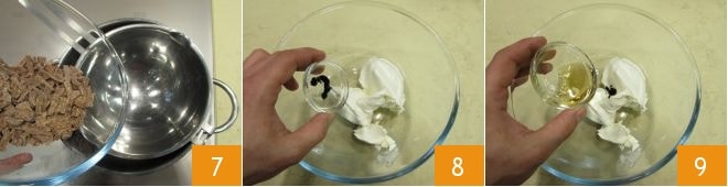 place it in a bain-marie 7 until it is completely melted. In a separate bowl, place the mascarpone, flavor it with the seeds extracted from the vanilla bean 8 and with the Rum 9 mix with a spatula to combine.