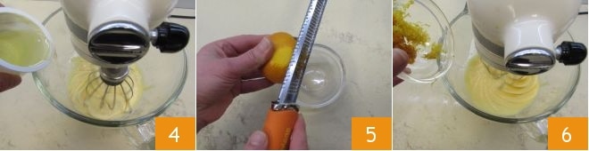 and the vegetable oil 4. Continue mixing the ingredients. Now grate the zest of 1 orange 5 and 1 lemon to add to the mixture 6.