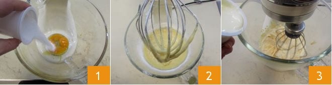 To prepare the citrus 7 jars cake, first separate the egg yolks from the egg whites. Beat the yolks with sugar 1 using a stand mixer with the whisk attachment 2. Add all the yogurt to the mixture 3