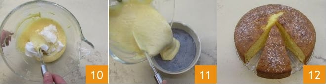 you can gently fold them into the mixture a little at a time. Be careful not to deflate the egg whites, mixing from top to bottom with a spatula to prevent the mixture from deflating 10. Take a cake pan and line it with parchment paper. Pour the mixture into the 9.5-inch diameter cake pan, leveling the mixture 11 and bake in a preheated static oven at 356°F for 40 minutes. Once baked, remove the cake and let it cool, then remove it from the pan and let it cool completely on a wire rack. When the citrus 7 jars cake is completely cool, you can sprinkle it with powdered sugar to taste 12!