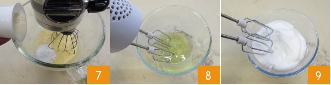 Then add the baking powder and the two jars of flour and the jar of potato starch after sifting them 7. Keep mixing all the ingredients. At this point, beat the egg whites using whisks 8 adding a pinch of salt. In a separate bowl, beat the egg whites with a pinch of salt using an electric mixer. When they are stiff 9