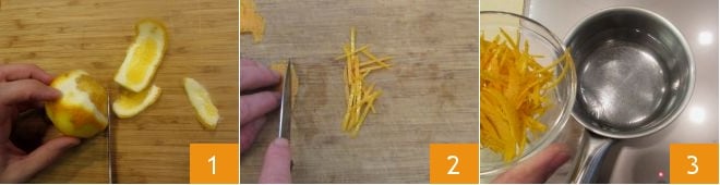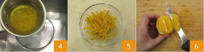 Then drain them 4 and repeat the operation, boiling fresh water and blanching the peels again: by repeating the process with new water, you will remove a percentage of the bitter taste from the peel. Drain the peels again and set aside 5. Extract the pulp segments of the oranges 6, trying to preserve the juice that comes out (you can collect it in a bowl).