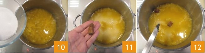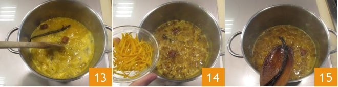 Mix the ingredients 13; turn on the heat to medium-low and bring to a light boil: cook like this for 35 minutes. After 35 minutes, you can also add the orange peels 14. Stir, then remove the vanilla pod 15 and the cinnamon sticks.