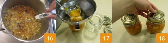Cook for another 35 minutes approximately: you will need to check the temperature with a kitchen thermometer: when it reaches 108°F 16, the citrus jam will be ready. You can store it, still hot, in the just sanitized jars using a funnel 17. Proceed by tightly screwing the jars 18 and letting the jam cool completely. Make sure, before consumption, that the lids do not make the classic "click-clack" sound when pressed in the center, indicating that the vacuum seal has not occurred correctly. For these and other instructions, we always refer to the information regarding homemade preserves from the Ministry of Health.
