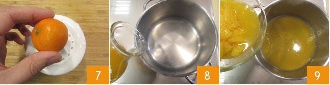 Then squeeze the juice from all the mandarins 7, filter it, and pour it into a saucepan 8; add the orange pulp and their juice as well 9,