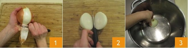 To prepare the citrus risotto, first start by preparing the broth. Clean the onion 1 and cut it in half 2. Place it on the heat in a fairly large pot with the cut side down 3.