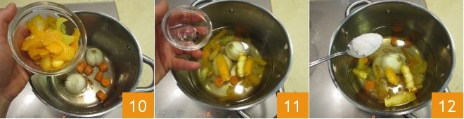 the orange and lemon peels 10. Then also add the black peppercorns 11 and a tablespoon of coarse salt 12.