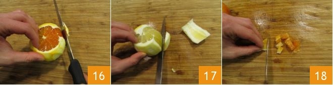 At this point, take the lemon and the orange from which you took the peel and peel them both completely (16-17), being careful to remove all the white part. Then cut the orange first into slices and then into cubes, trying not to lose the juices 18.