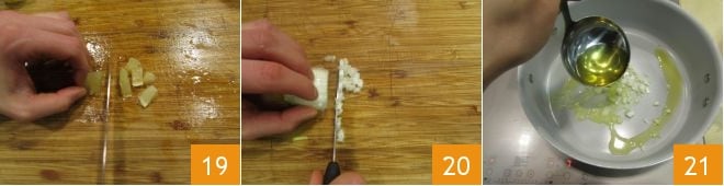 Repeat the same operation for the lemon, to obtain cubes of the same size. Finely chop the onion 19 and let it brown in a pot with the oil, adding a ladle of broth to stew it gently 21.