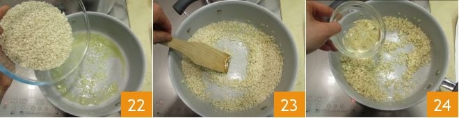 Only when the broth has evaporated and the onion is well wilted, add the rice 22. Toast it over medium-low heat for about 2 minutes, stirring often 23, then deglaze with the white wine 24.