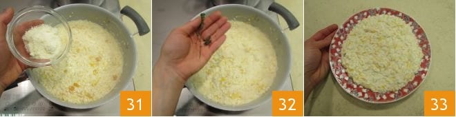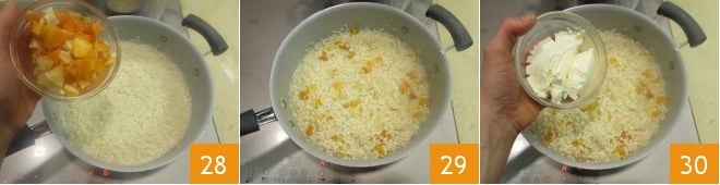 Add the citrus cubes 28 and stir to combine everything 29; don't worry if the citrus cubes don't remain intact but slightly crumble. As soon as it is perfectly cooked, turn off the heat and add the mascarpone 30.