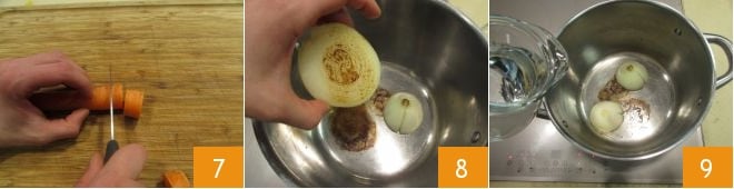 Move on to the carrot, cut it into pieces without peeling it, but make sure to wash it well 7. As soon as the onion is well browned 8 add the water 9 to the same pot, along with the carrots