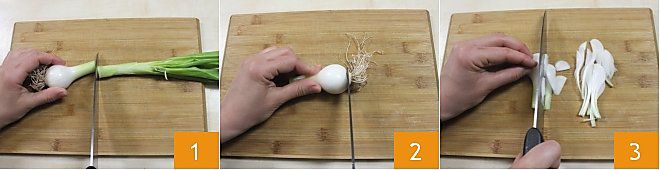 To prepare the salmon clafoutis, start by cleaning the fresh scallion: cut the stem 1, remove the base 2, and chop it finely 3.