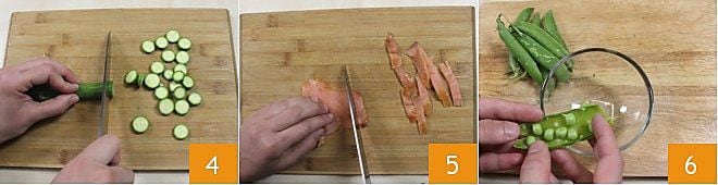 Wash the baby zucchini carefully, trim them by removing both ends, and then cut them into slices 4. Place the salmon fillet on the cutting board, slice it into strips, and store it in the fridge until ready to use 5. Then shell the fresh peas, removing the pod, and transfer them into a small bowl 6; you will need 100 g of shelled peas.