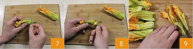 Then take the zucchini flowers, wash them by gently immersing them in cold water, then drain them and lay them on a dry cloth, patting them lightly. Transfer them to a cutting board and remove the growths at the base of the calyx 7. Remove the fleshy pistils inside 8 and divide the flowers in half 9. Set them aside in the refrigerator; you will add them just before baking the clafoutis.