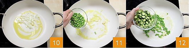 In a non-stick pan, heat a drizzle of oil and let a peeled clove of garlic brown, then add the chopped scallion 10 and let it sauté. Also add the shelled peas and the baby zucchini cut into slices (11-12). Let them cook over low heat for about 20 minutes.