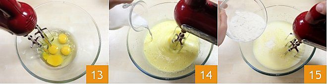 Meanwhile, prepare the clafoutis mixture: break the eggs into a bowl and beat them with an electric mixer until well whipped 13. Then gradually add the milk 14 and finally the flour 15. Salt and pepper the batter to taste.