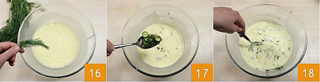 Add the dill to the mixture, breaking it with your hands 16, then pour in the cooked vegetables 17 and stir to combine the mixture 18.