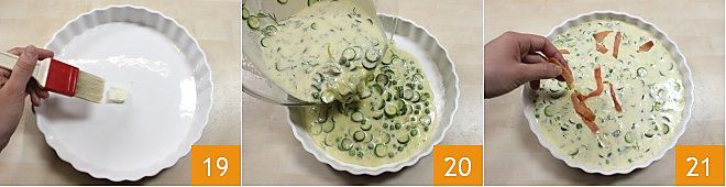 At this point, butter a shallow mold with a diameter of 10 inches 19. Pour the mixture into the mold 20, take the salmon strips out of the fridge and arrange them on the mixture as you like 21.