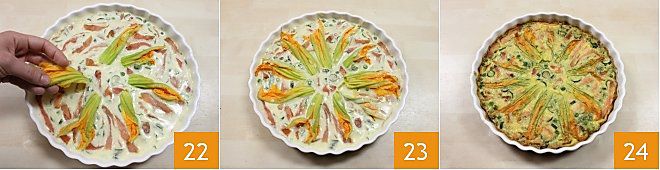 Now decorate with the zucchini flowers that you cleaned and divided: arrange them radiantly on the mixture 22. Once decorated 23, all that remains is to bake the clafoutis in a preheated oven at 350°F for 30 minutes (if you use a fan oven, bake at 320°F for 20 minutes). When the surface is pleasantly golden, your salmon clafoutis will be ready to be removed from the oven and served hot 24!