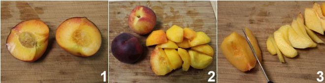 To prepare the peach clafoutis, start by preheating the oven to 350°F. Wash the peaches, cut them in half or quarters, remove the pit, and peel them (1-2). Slice the peaches into not-too-thin slices 3.