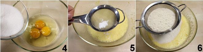 In a bowl, beat the eggs with the sugar using an electric mixer 4 until you obtain a light and frothy mixture that doubles in volume. Add the vanillin 5 and the flour 6 with a sieve.