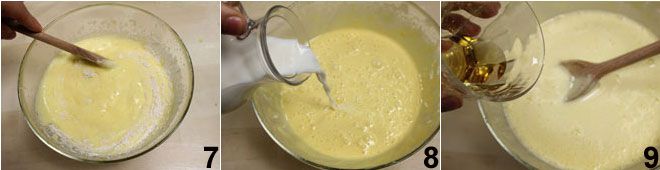 and fold them into the mixture with a wooden spoon 7. At this point, gradually add the milk 8, stirring gently. Once all the milk is absorbed, add the brandy 9.