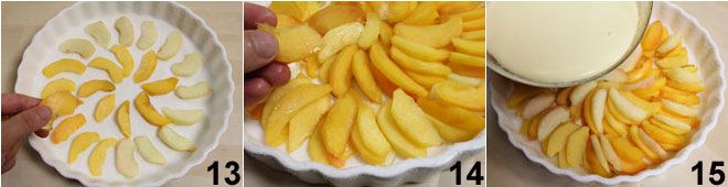 Arrange the peaches on the bottom of the baking dish in a circular pattern or as you prefer, creating multiple overlapping layers if desired (13-14). Once you've arranged all the peaches, gently pour the egg, sugar, and milk mixture into the dish, covering all the peaches except those at the top 15. Bake for 50 minutes until the clafoutis is golden brown. Once baked, remove the peach clafoutis from the oven and dust with powdered sugar. Let it cool slightly and serve your peach clafoutis warm.