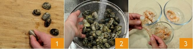 To prepare clam soup, first make sure that the clams do not contain sand: tap each one on a cutting board on the open side 1. If dark sand comes out, it means the clam is full of sand and should be discarded. Also discard any with broken shells. Then place them in a colander resting on a bowl and rinse them several times 2 under running water: finish when no more sand is visible in the bowl. Set them aside for a moment; move on to the How to clean shrimp. Remove the head (if present), then shell them (keep the shell aside) 3 and remove the black thread (the intestine) by delicately incising the back of the shrimp and pulling it out gently with a toothpick.