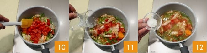 and add the cherry tomatoes 10. Then pour in 500 g of water 11, the coarse salt 12, and the white peppercorns;