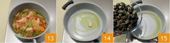 cook the broth for at least 30 minutes over medium heat 13. Meanwhile, take the clams, drain them and toss them into a large saucepan where you have sautéed a whole garlic clove (so you can remove it more easily) (14-15).