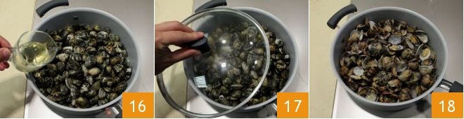Deglaze with 150 g of white wine 16, then cover with a lid 17 and cook until the shells open, over high heat. Once ready 18,